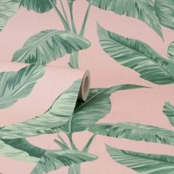 Styled with a trendy banana leaf design, this wallpaper gives a quick refresh to any room. The design is printed onto a beautiful blush pink backdrop helping bring a touch of nature into your home. Easy to apply, just paste the paper!