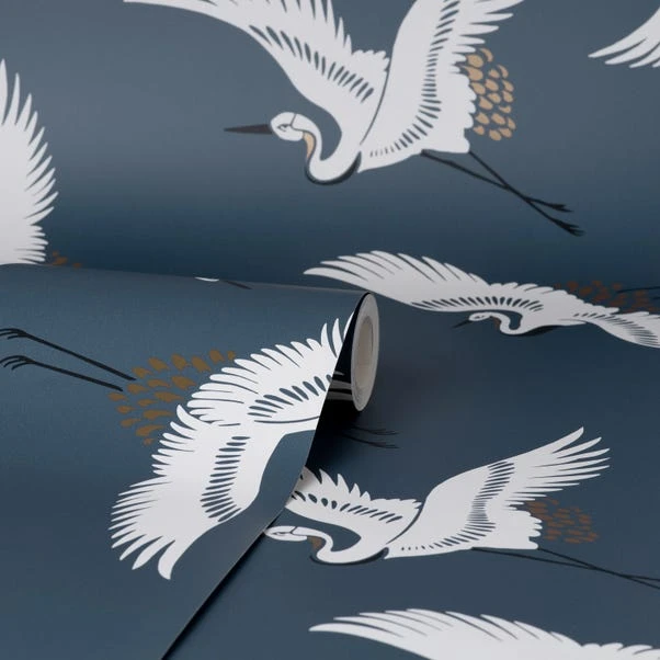 Featuring an artfully elegant and sophisticated flying crane design placed upon a contemporary coloured background with metallic highlights. This stunning luxury wallpaper has a bold and lavish appearance, perfect for a feature wall or decorating a full room. Wallpaper has a smooth effect finish, traditional paste the paper application and 26.5cm drop match repeat pattern.