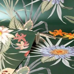 With a bold lavish appearance, this stunning tropical luxurious tropical floral design is perfect for a feature wall or a full room. This wallpaper boasts a rich emeralnd green background which helps the striking colours to stand out. Easy to apply, just paste the paper!