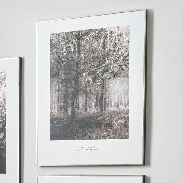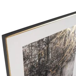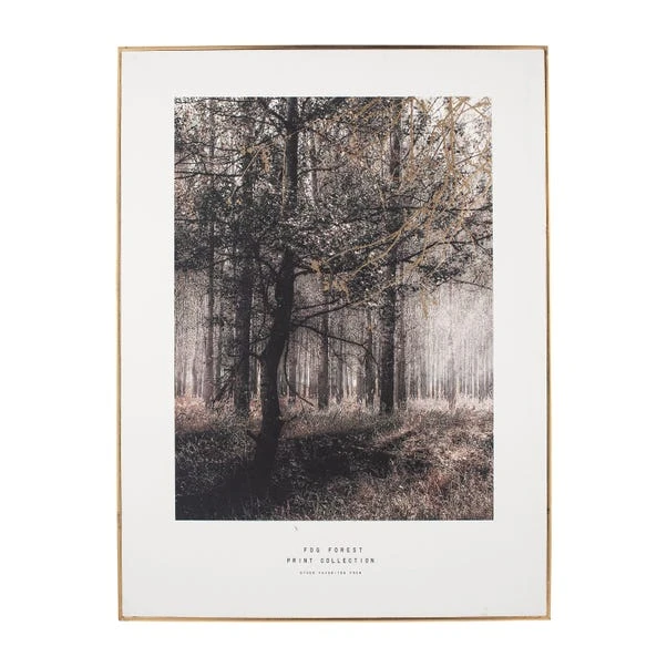 Part of the Fog Forest Print Collection, this detailed monochrome print presents a natural forest scene with accents of gold detailing to highlight key areas and draw attention to the artwork. Along with the gold detailing, the gold wooden frame emphasizes the outstanding quality, so this print is perfect for discretely adding décor to a space without appearing too invasive or distracting.