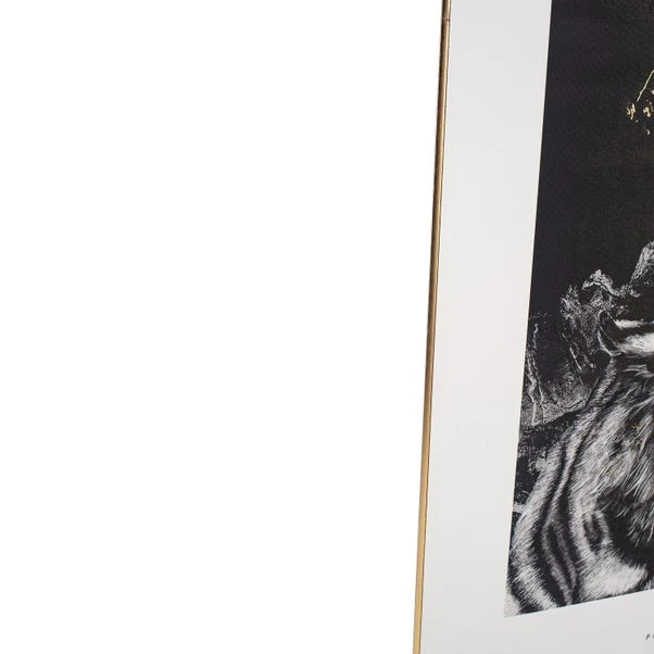 Transform your interior wall décor with this magnificent print displaying an intensely detailed monochrome image of a fierce tiger with accents of gold detailing to accentuate the texture and depth. Along with the gold detailing, the gold wooden frame emphasizes the premium appeal, so whether you want to discretely add some subtle décor or show off this superb look, this print will enhance your space.