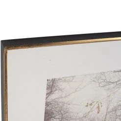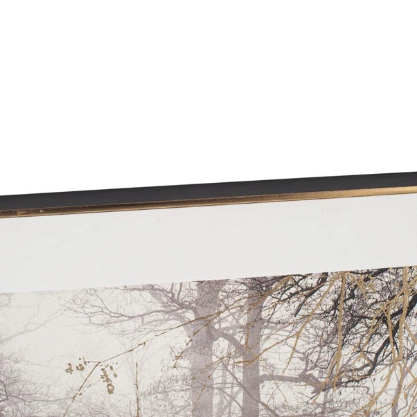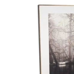 Part of the Fog Forest Print Collection, this detailed monochrome print presents a natural waterside scene with accents of gold detailing to highlight key areas and draw attention to the artwork. Along with the gold detailing, the gold wooden frame emphasizes the superior appearance, so this print is perfect for discretely adding décor to a space without appearing too invasive or distracting.